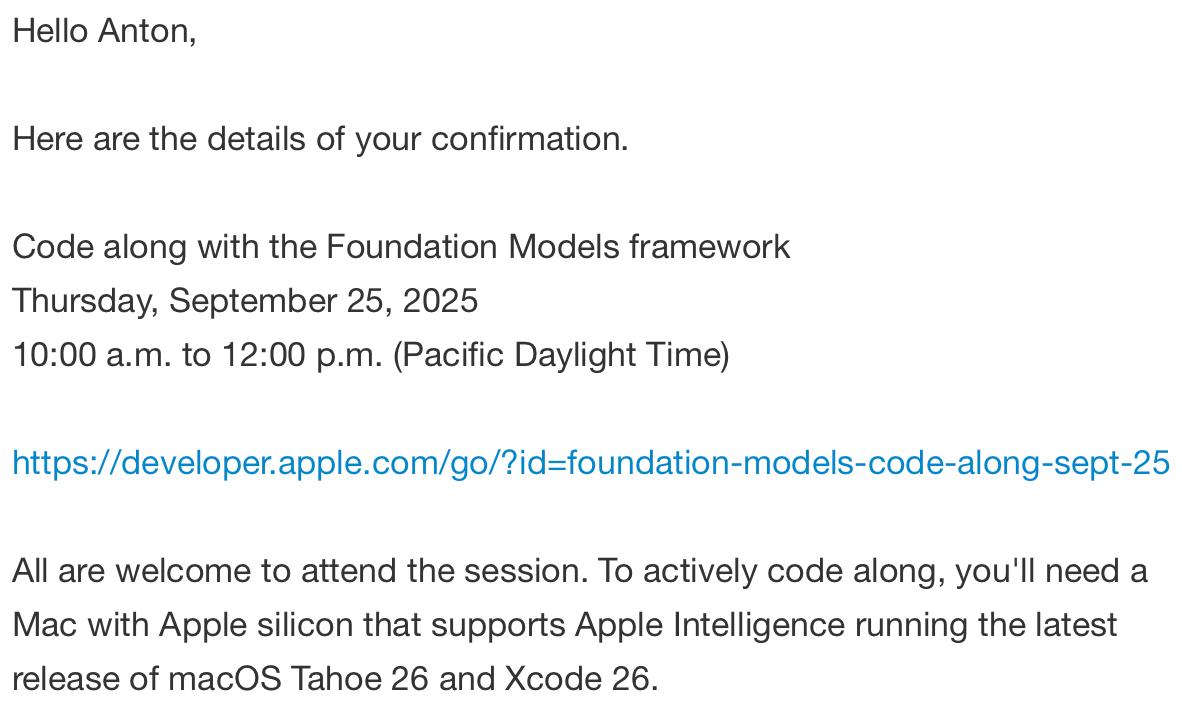 After signing a short form linked to my Apple Developer account, another email with a calendar event arrived in my inbox. Then it was just a matter of waiting.