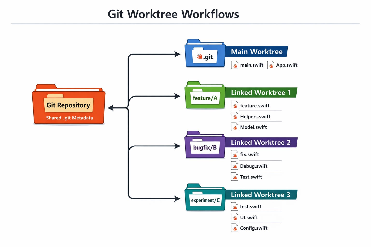 That’s exactly what Git Worktrees let you do. Technically, worktrees create separate working directories that are all linked back to the same .git repository. You can have one directory on main, another on feature/foo, and another on hotfix/bar, all open at once. Each has its own working set of files, but they share the same Git history and object database — so commits, tags, and branches stay in sync without duplication.
